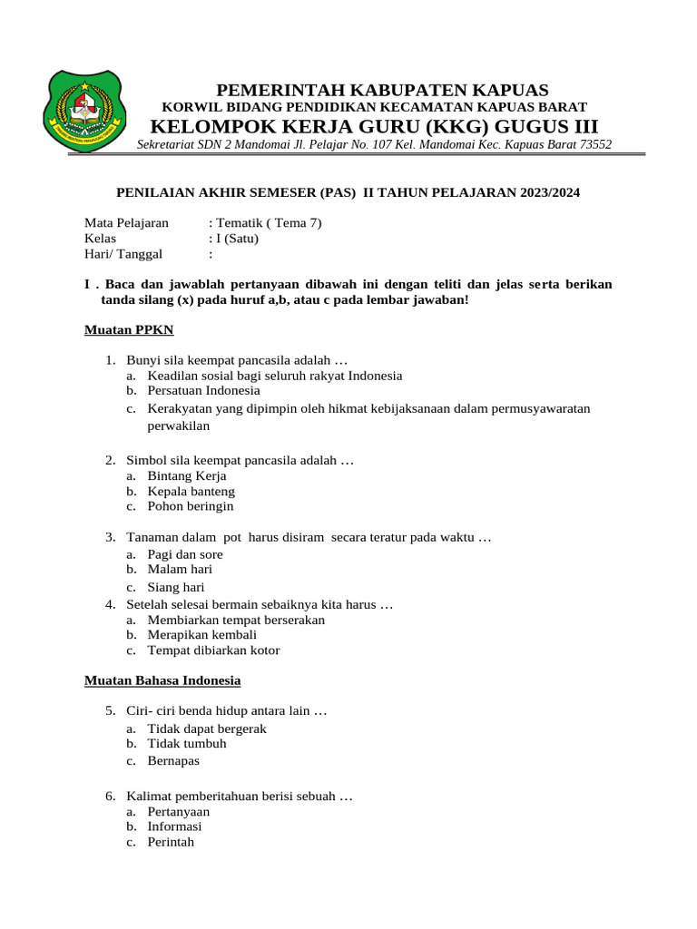Soal yang Melibatkan Aspek Tematik: Tema 7 berfokus pada benda, hewan, dan tanaman. Soal yang baik akan mencerminkan hal ini, misalnya: